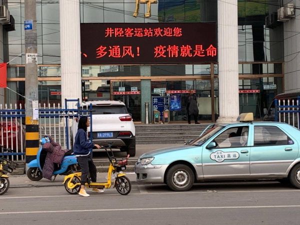 井陉县城客运站,一名行人正在骑行共享电单车