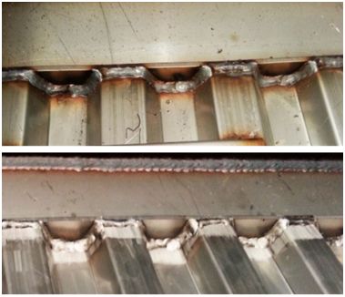 不锈钢点焊焊痕激光清洗对比图(左为清洗前,右为清洗后)