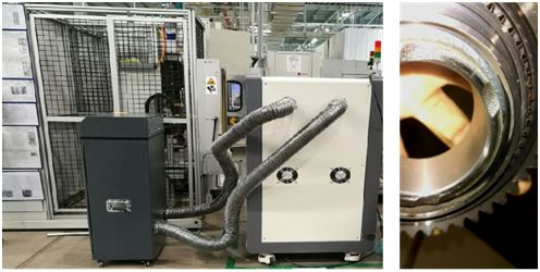 变速箱齿轮激光清理设备(左)及齿轮清洗后焊缝(右)