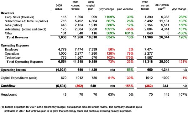 以下是2006年完整的财务数据,根据11月下旬的估算。该公司的运行费(run-rate)为1700万美元(每月140万美元),经营上基本达到收支平衡。2007年的预测是非常初步的,目前对明年如何积极地增加员工有一些争论。创始人里德的初步建议是,在2600万美元的收入上,在盈亏平衡的情况下运营,要非常积极,将大量资源集中在产品改进上。