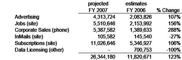 LinkedIn在现有的几个大市场中产生了收入。以下是LinkedIn 2006年(几乎和实际收入一致)和2007年的预计收入明细,下面是对每个产品和市场的简要说明。