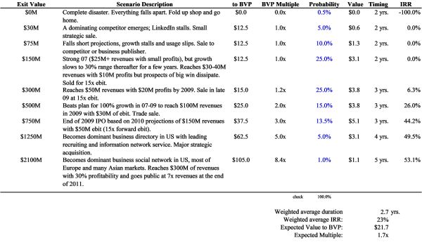 LinkedIn是为数不多的具有发展势头和市场潜力的消费互联网公司之一,可以成为一家价值数十亿美元的企业。尽管我们当然更愿意以较低的价格推荐这笔交易,但鉴于BVP可获得的机会风险/回报相对诱人,我强烈支持这项投资。