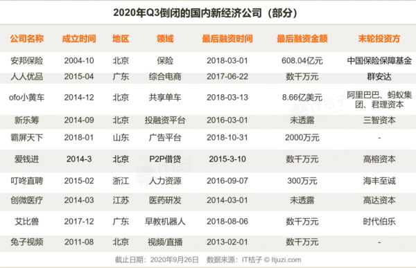 那么,在刚刚发布的第三季度国内新经济投融资数据报告中,有哪些公司倒闭案值得关注?