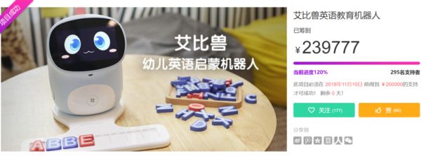 还有一家早教英语启蒙机器人研发商“艾比兽”也倒闭了,该公司在 2018 年 11 月通过京东众筹获得了近 24 万元的筹资,达成预期 20 万元目标。从页面描述来看,艾比兽是一款独角兽外形机器人,其市场售价达到 1299 元,有用户反馈无法识别字母、识别不准的问题。