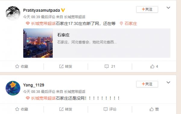 据微博网友反映,昨天下午开始,包括天津、郑州、重庆、武汉、石家庄等多地都出现断网的情况。有网友吐槽“长城宽带”是不是跑路了?