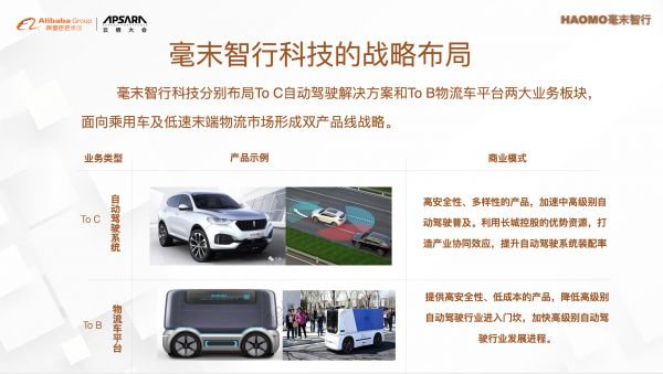 毫末智行的定位是自动驾驶解决方案提供商,目标是与合作伙伴共同实现城市交通的零事故、零拥堵、自由出行和高效物流。基于这个目标,毫末设立了两个落地方向:城市场景下的自动驾驶乘用车、物流无人小车。