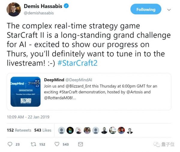 DeepMind CEO哈萨比斯说:“星际2是一款复杂的实时战略游戏,对AI来说是一个长期的巨大挑战。我们将展示我们的进步!你肯定不想错过直播!”:-)