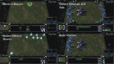 工具包推出同时,他们还开源了一套星际2的迷你游戏,是星际2部分操作的抽象产物,AI能从中练习移动、采矿、建造单位等等技能。