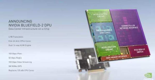 据介绍,BlueField-2 DPU具有英伟达Mellanox Connext-6 SmartNIC的所有特点,与8个64位的A72ARM处理器内核一起,实现可完全编程,并能提供每秒200千兆比特的数据传输速率,从而加速关键数据中心的安全、网络和存储任务。
