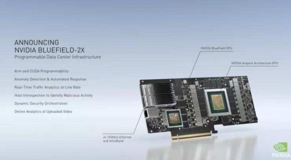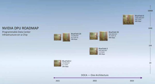而BlueField-2X DPU则拥有包括BlueField-2 DPU的所有关键特性,其特性能够通过英伟达安培GPU的AI功能得以增强。而在英伟达的路线图里,未来的Bluefield-4 将会引入CUDA 和 NVIDIA AI,极大加快网络中计算机视觉应用处理的速度。