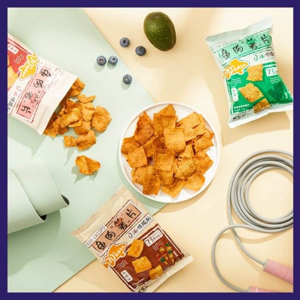 凭借独创的膨化工艺,食验室几乎将薯片脂肪含量压缩至0。其推出的鱼肉脆片每100g脂肪含量仅为0.6g,相较之下非油炸薯片约为26.4g。食验室此前推出的首款产品“深海金枪鱼脆”,提供比非油炸薯片9倍高蛋白摄入量,除产品创新外,食验室还不断尝试推出多样风味,相继推出鱼原味、黑椒味、海苔味、樱花虾、烧烤味、魔鬼椒味等多种口味。