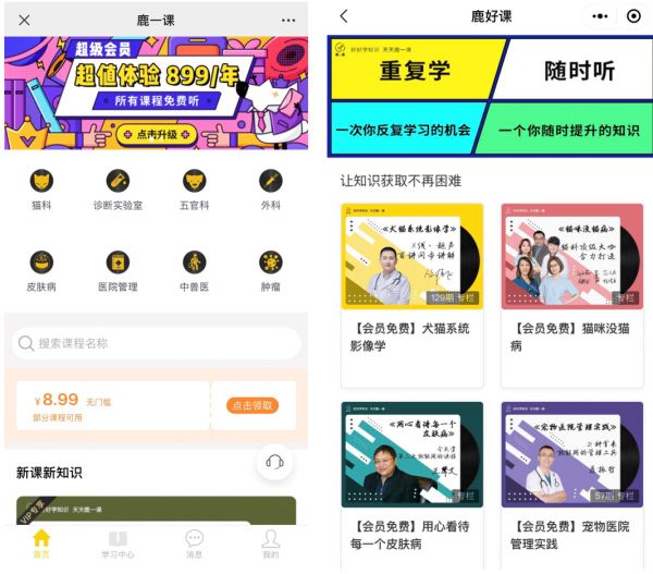 目前,鹿一课的内容包括知识专栏、病例训练、文献解读、短视频等形式,共六百多个知识点。热门课程包括《犬猫系统影像学》、《一起学检验》等,2020年5月GMV突破10万,付费用户占比约20%。除了理论知识,未来平台还将针对实操场景上线实操视频、病例训练等功能。