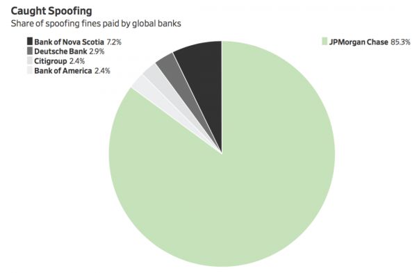 监管机构说,摩根大通所承认其交易员使用的欺诈策略,是一种快速下单然后立刻取消的伎俩,这种交易手段会扭曲供需状况,从而导致价格朝着操纵者设计的方向发展。