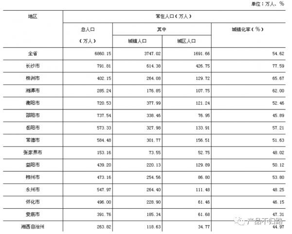 虽然全国的城镇化率超过50%,大部分省份声称城镇化率超过50%,但是大部分人口并不生活在地级市及以上规格的城市。如下表所示,湖南省城区的人口占省内人口的比例是24.6%,但是城镇化率是54%。