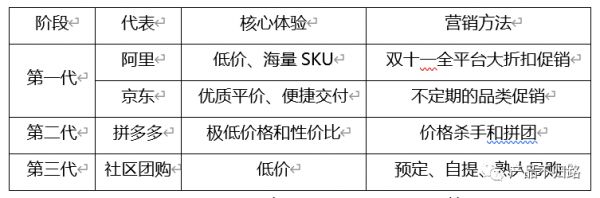 被视为第三代电商的社区团购主攻低价,营销方法是预定、自提,半熟人导购。