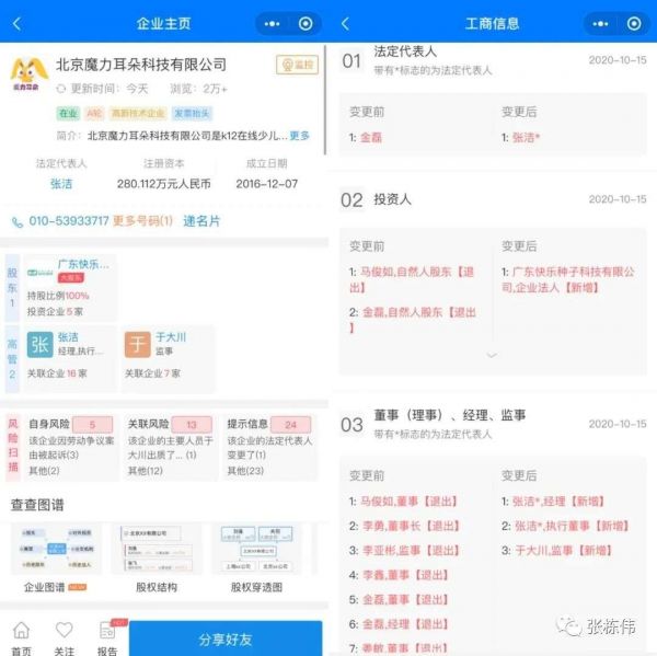 有趣的是,今天就看到消息,我和郭开森、杨帆、于斌、裴照星喝酒论道的当天,魔力耳朵已于10月15日正式完成了工商变更,卖给了“豌豆思维”。此前持股42.585%的猿辅导(母公司北京猿力教育科技有限公司)、持股23.018%的魔力耳朵创始人金磊等均已退出股东队列。