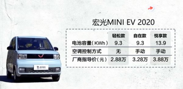 目前宏光MINI EV共有三款车型,分别是2.88万元的轻松款、3.28万元自在款和3.88万元悦享款。而市面上的低速电动车定价大多是在5-8万元之间。