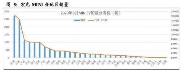 东北证券发布的报告显示,三、四线城市是宏光MINI EV的主要销售地。按照上险量来看,其中河南、山东是宏光MINI EV 9月销售量最高的2个地区,合计占到其总销量的35.1%。