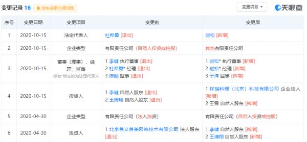 值得一提的是,今年的4月30日,公司投资人刚刚由北京善义善美网络技术有限公司变更为李健和王清翔。雷达财经注意到,上述公司现名为北京人人车旧机动车经纪有限公司,目前李健还保留着该公司的执董职位。