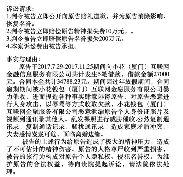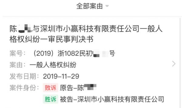 比如,去年年底有一位陈姓用户起诉小赢科技,以侵犯名誉权为由,索赔5万元。