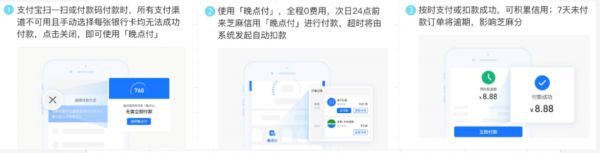 “晚点付”给到用户的“授信额度”更低,资金使用周期更短,按照其服务协议:您可在使用本服务后的第二天24点以前通过“支付宝-芝麻信用-晚点付”进行主动支付。