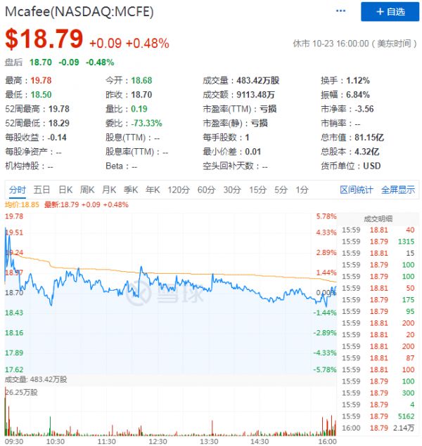10月22日晚间,杀毒软件公司McAfee正式在纳斯达克挂牌上市。上市首日,股价下跌6.50%至18.70美元,市值为80.76亿美元。在软件服务公司的IPO热潮之下,McAfee股价并未如愿上涨。截至发稿时,公司股价为18.79美元,涨幅为0.48%,市值来到81.15亿美元。