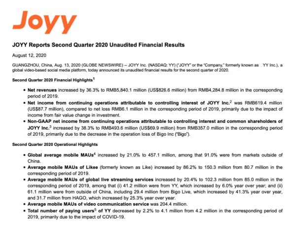 在YY公布的2020年第二季度未经审计财务报告中,欢聚集团全球平均移动端月活跃用户同比增长21.0%至4.57亿,其中91.0%来自海外市场。全球直播服务的移动端月活跃用户同比增长20.4%至1.023亿,其中YY直播用户4120万,中国以外为6110万,包括来自于Bigo的2940万以及来自Hago的3170万。
