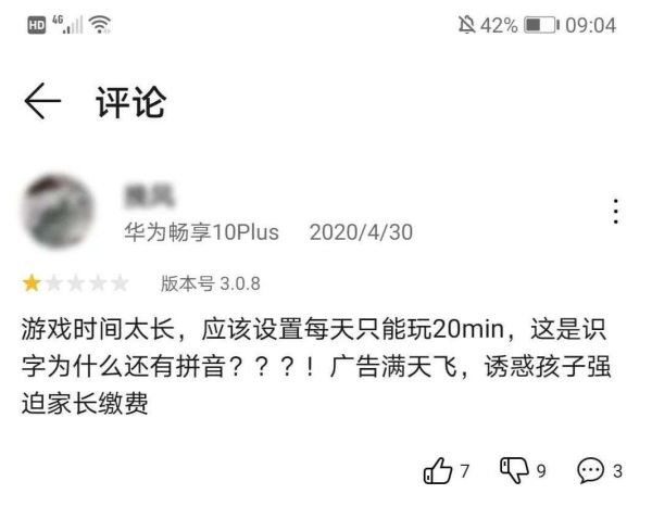 “游戏时间太长,应该设置每天只能玩20min,这是识字为什么还有拼音???!广告满天飞,诱惑孩子强迫家长缴费。”在华为应用市场中,一位用过洪恩识字APP的网友如是吐槽道。