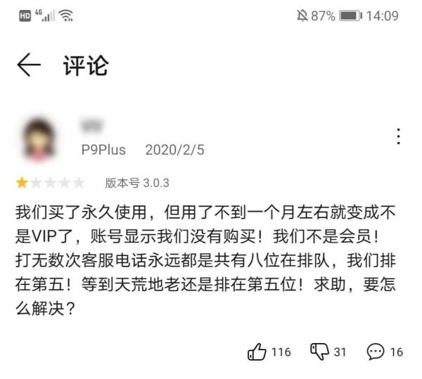此外,也有网友吐槽自己买了永久识字包,结果仅使用了不足1个月时间就莫名变成了“非会员”,同时,客服电话形同虚设。