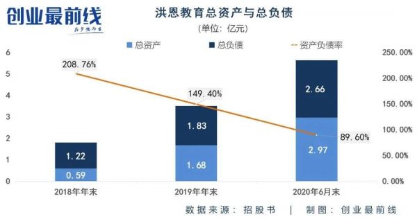 根据招股书,截至2018年年末,洪恩教育总资产为5859.9万元,总负债达到1.22亿元,资产负债率高达208.76%;到了2019年年末,该公司的总资产虽达到1.68亿元,但总负债也增长至1.83亿元,资产负债率达149.40%;截至今年6月末,洪恩教育总资产为2.97亿元,超过了2.66亿元的总负债,但资产负债率仍高达89.60%。