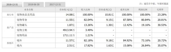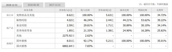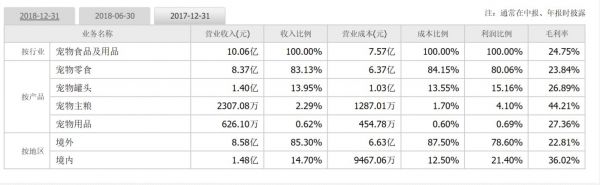 根据中宠股份(SZ:002891)2017、2018两年的业务信息对比图(上图),在中宠股份(SZ:002891)的财报中也可以看到,除宠物罐头的毛利率有一定上升外,其他的产品毛利率指标都有降低。