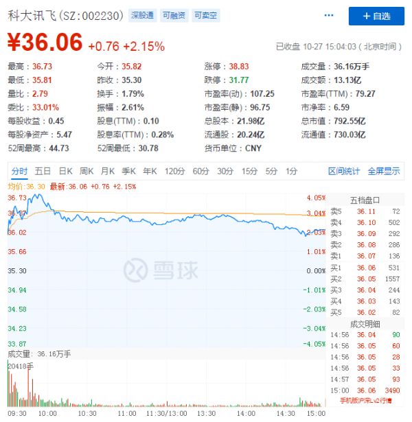 受科大讯飞第三季度财报的影响,截止A股10月27日收盘,科大讯飞股价上涨2.15%,报36.06元,总市值达729.55亿元。