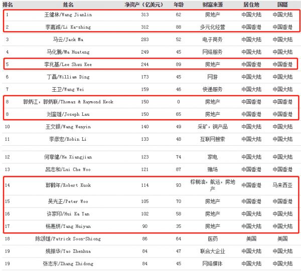 2017年,中国房地产王健林、李嘉诚联袂福布斯中国华人富豪榜前二名,前20的还有近十位其他华人地产富豪入榜,包括香港四大家族也是常驻其中。