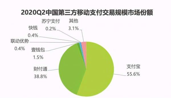 相关资料显示,近三年来,中国移动支付的市场格局没有明显的变化,烧钱抢市场阶段基本结束。按交易额计算,在2020年一季度,腾讯支付的市场份额为39%,仅次于支付宝的55%;二季度支付宝市占55.6%,财付通38.3%,二者长期维持着这一领域的双寡头局面。