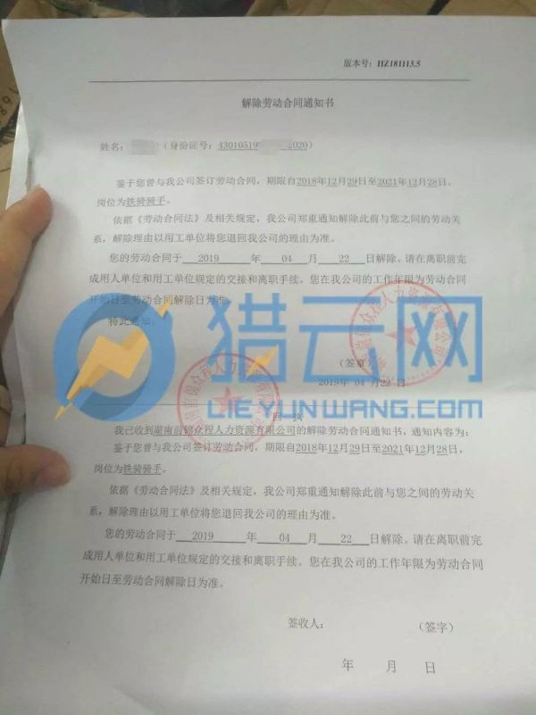 “前程无忧方面要求我们带着解除劳动合同通知书去办理离职手续,办好了全额发放工资,不办理一分钱也没有。”上述长沙铁骑阿音表示。