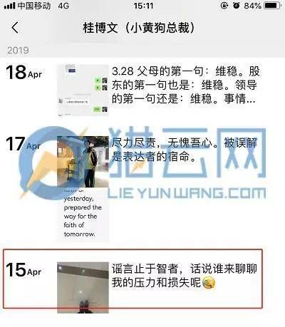 猎云网注意到,小黄狗总裁桂博文在4月15日发朋友圈称:“谣言止于智者,话说谁来聊聊我的压力和损失”。疑似回应此次小黄狗资金冻结、欠薪事件。