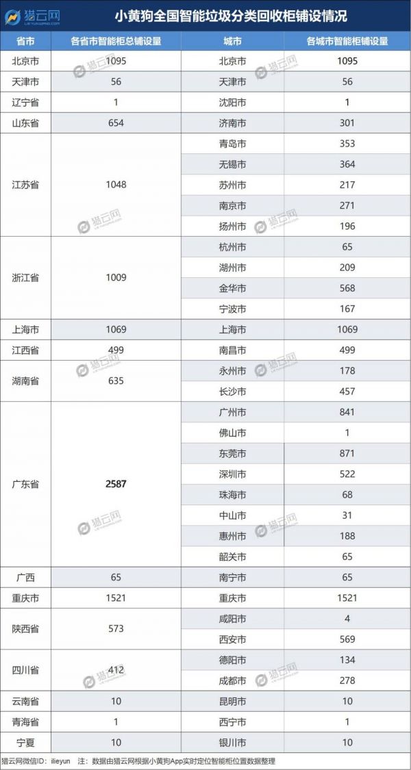 据猎云网统计,根据小黄狗App上实时定位到的智能柜数据显示,小黄狗已入驻17个省市共34个城市,总铺设11245台。