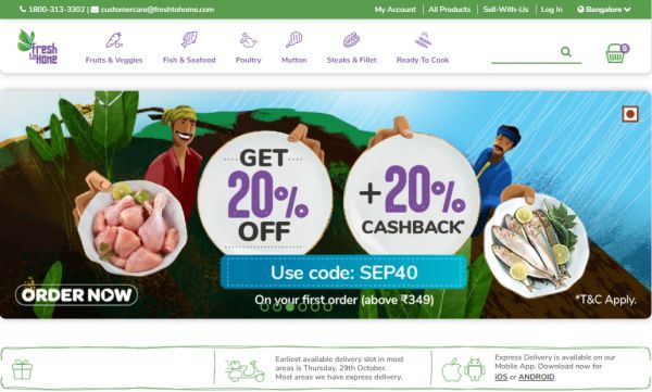 生鲜电商 FreshToHome 由 Shan Kadavil 成立于2015年,总部位于印度班加罗尔,旨在为消费者提供蔬菜、鱼类和肉类等生鲜食品。