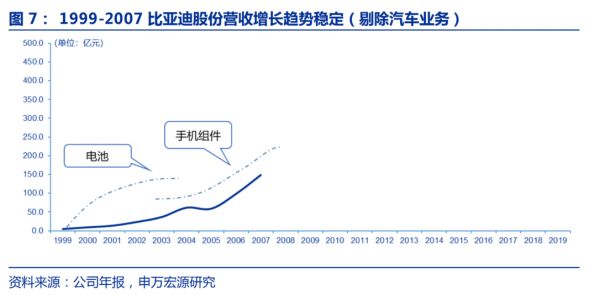 1993-2007年是比亚迪的初创期,从早期的作坊式生产开始极速扩大规模,并在手机电池业务做到全球第一后,择机开启了手机零部件业务,最终成就了比亚迪电子如今的规模。