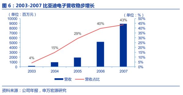 2003年起,比亚迪陆续推出屏幕、镜头模块、键盘机壳模具、软性电路板等产品,“水到渠成”地开展手机组装业务。2007年,手机零部件及组装业务收入达91.9亿元,占营收的43.3%,几乎再造了一个比亚迪。