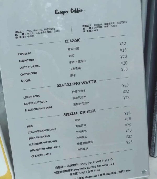仔细看Creeper coffee的菜单,只有咖啡和气泡水两个系列产品,两款拼配豆子。
