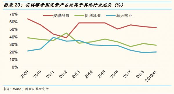 反映在资本结构上,安琪酵母的非流动资产规模庞大,其固定资产支出占比几乎都在50%以上,远高于伊利和海天味业。