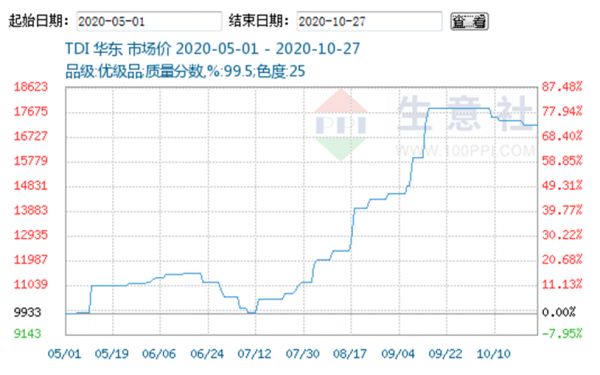 生意社TDI数据师10月27日向《每日经济新闻》记者介绍,5月1日,华东地区TDI市场均价在9933.33元/吨,截至10月26日,价格为17166.67元/吨,涨幅区间72.82%。6月中旬至7月初,TDI价格一度出现下调,自三季度以来,TDI价格走势持续上涨。这主要受供应紧张及需求回暖影响,其中海外工厂利好支撑较大,同时出口订单也持续利好。多方影响下,国内TDI工厂挺市拉涨态度明显,大厂相继大幅上调挂牌价格,市场在接受工厂指引后,价格跟随上调,主流经销商也跟随工厂步伐,报价大幅上调。只是在进入10月后,TDI市场行情以偏弱运行为主。