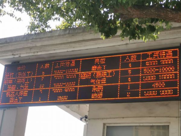 安吉县一家具厂门口LED屏打出的招工广告。