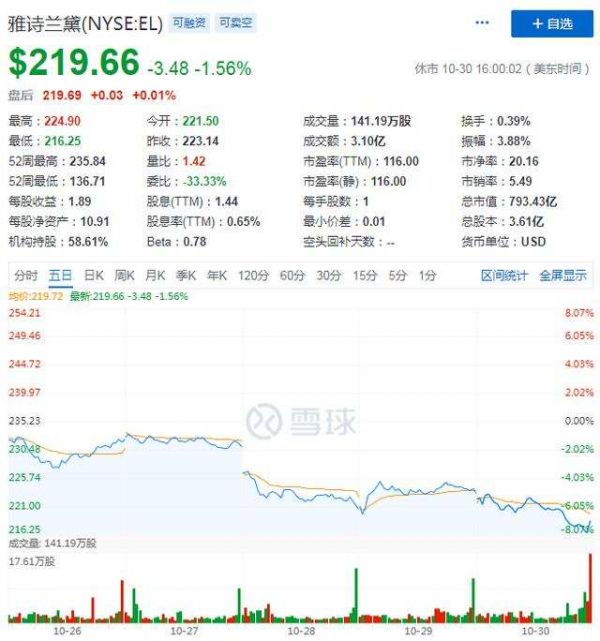 除了拥有众多全球知名的奢侈化妆品,雅诗兰黛集团在美股资本市场上的股价也是一个身份象征。截至目前,雅诗兰黛股价为219.66美元,市值为793.43亿美元。