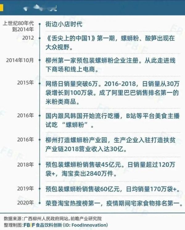 2018年,螺蛳粉就成为淘系电商米粉品类销售的第一名,据媒体报道,2019年,柳州袋装螺蛳粉已经实现平均每天销售150万包,螺蛳粉的全行业年营业额已经超过了100亿。