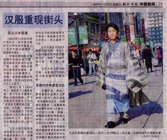 2003年11月,34岁的王乐天穿着一身价值760元的汉服,行走在河南郑州市区的广场、公园、商场和步行街。