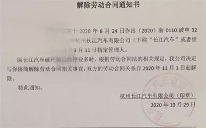 然而如今,这些员工等到的却是《解除劳动合同通知》与《解除劳动合同关系协议书》。这份最新的通知显示,双方的劳动合同关系自2020年11月1日起解除,原因是“长江汽车破产前已经停业多时,根据劳动合同法的相关规定,我司决定与你协议解除劳动合同相关事宜。”而对于职工债权中的部分工资,长江公司则是请求当地政府先行垫付,但垫付的额度和时间将由政府决定。