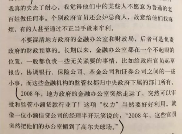当然,也并不是每个地方的金融办都对发展小贷公司报以那么积极的态度,而且这种并不算十分透明的审批机制也造成了一定的寻租空间。例如,多次求助监管无果的张化侨就曾在其书中愤愤不平地谈及此事。