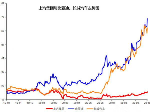 从今年六月份以来,比亚迪(SZ:002594)和长城汽车(SH:601633),股价都翻了两倍,而大众中国的合资伙伴上汽集团,股价还是在原地踏步。